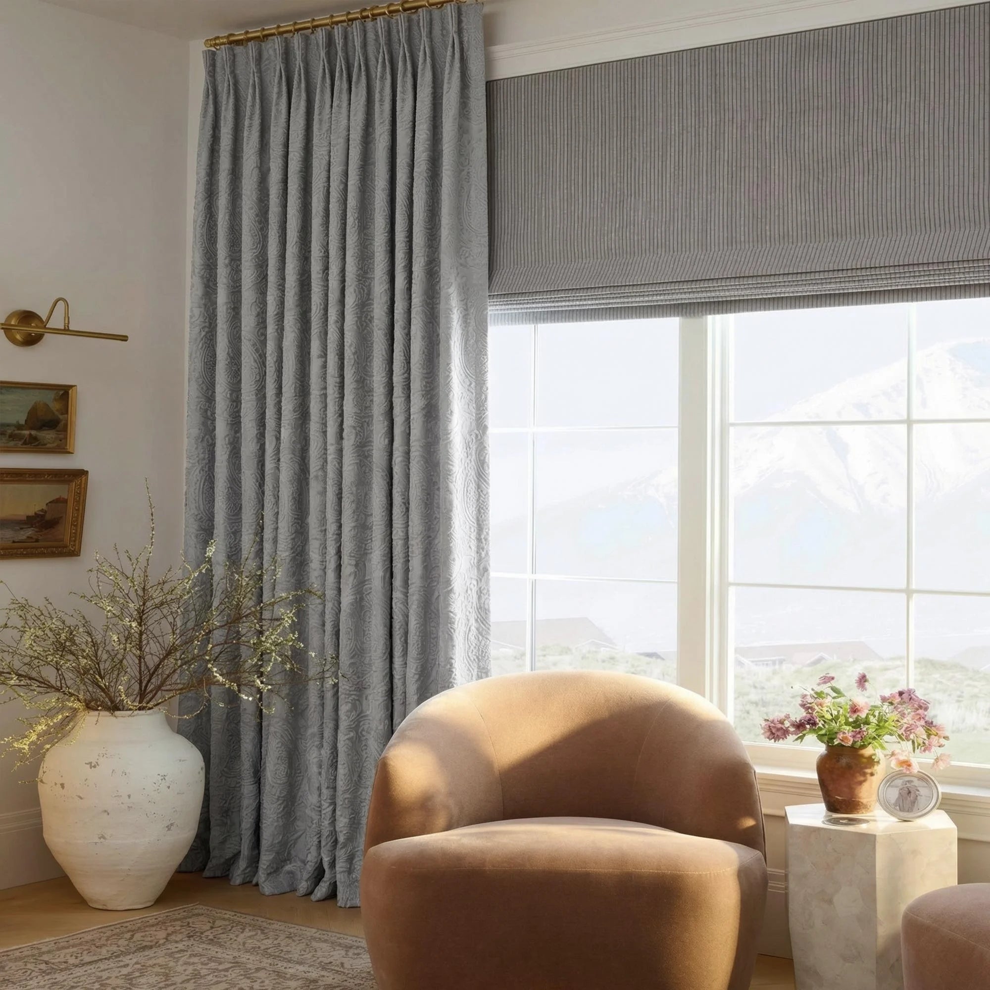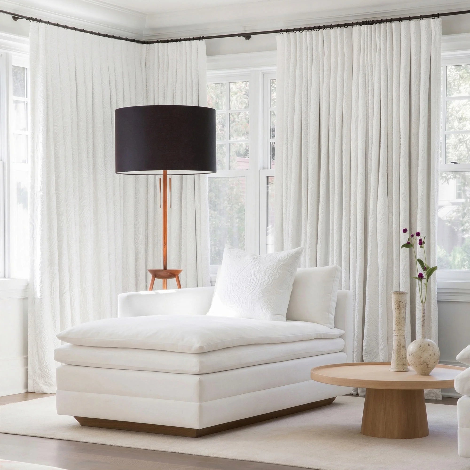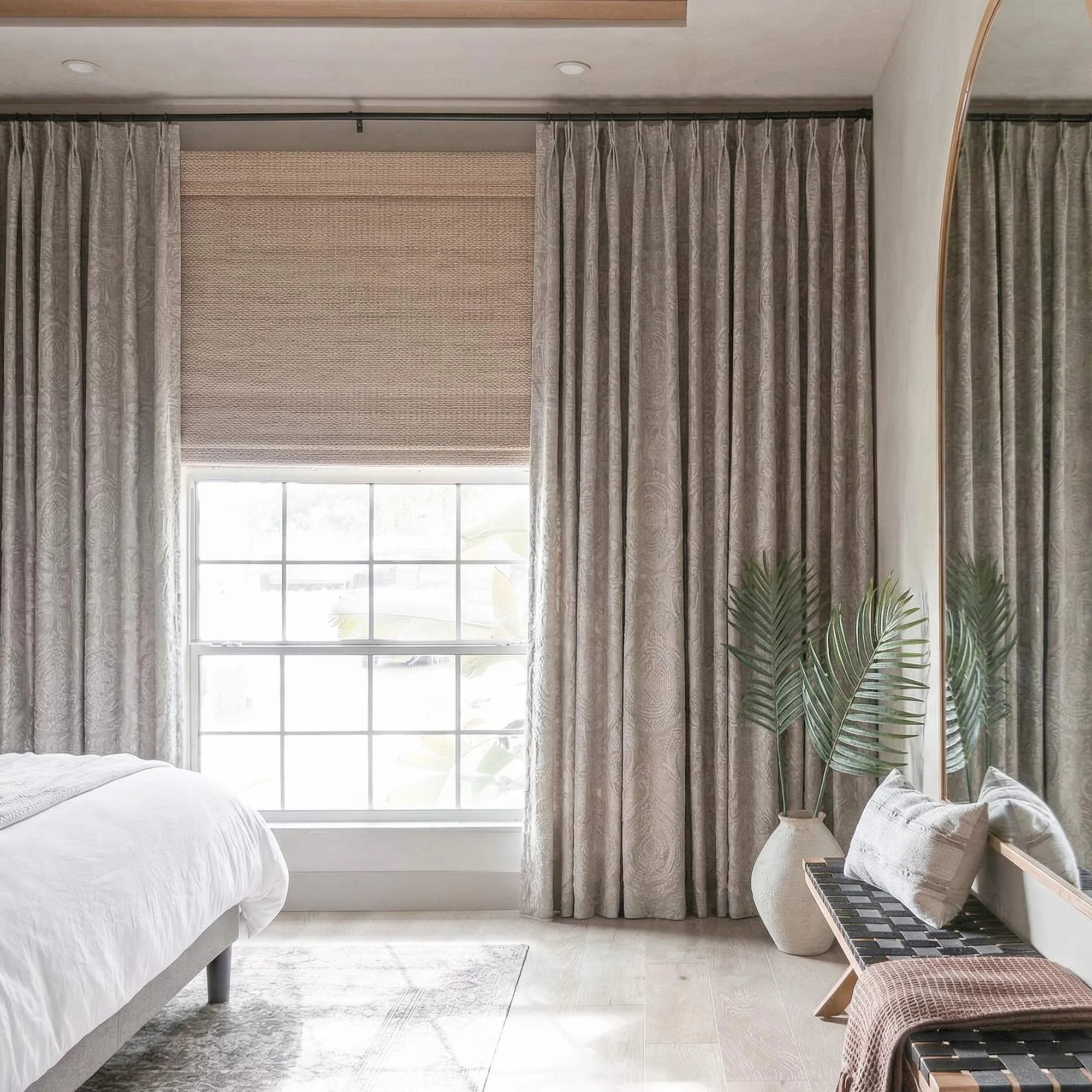 To achieve an automatic curtain system for wide and high areas, pair the pleated header style curtains with the Jason Motorized Track.