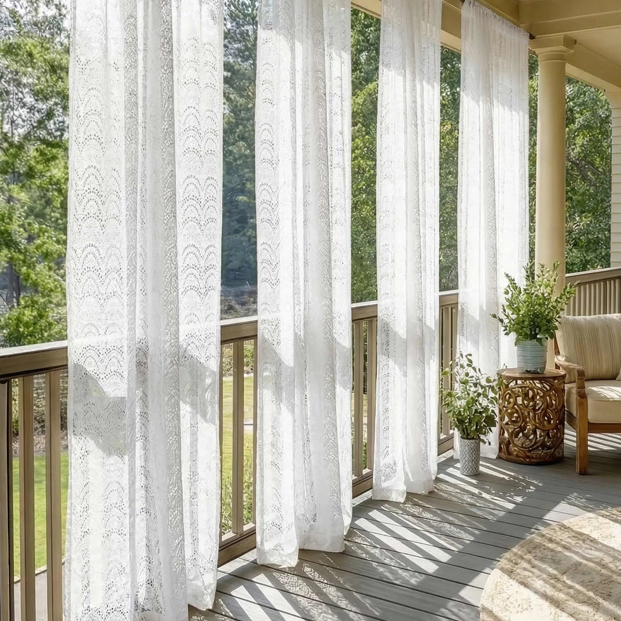 White juliette lace curtain with blurred green foliage in the background