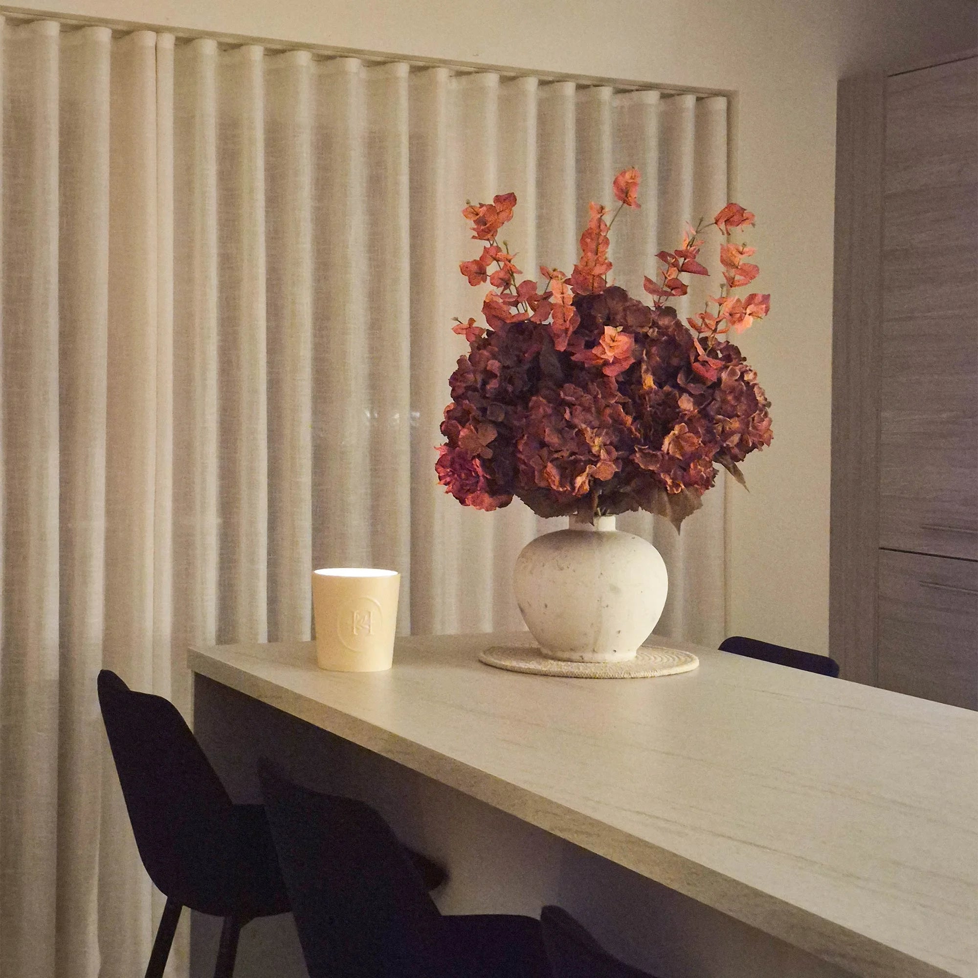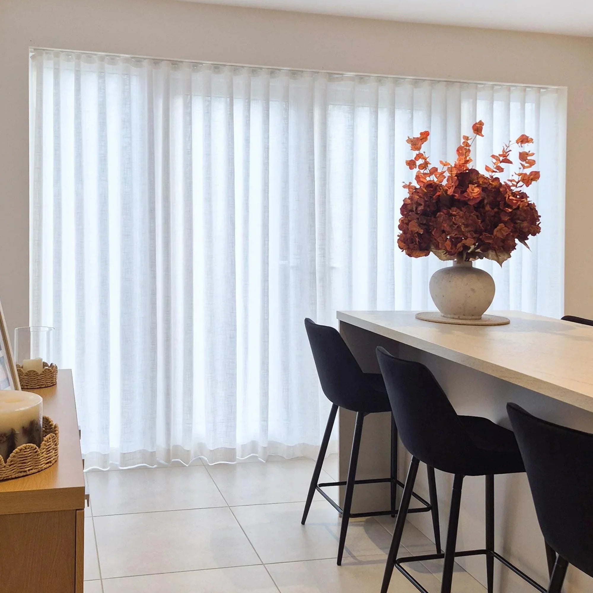 To achieve an automatic curtain system for wide and high areas, pair the pleated header style curtains with the Jason Motorized Track.